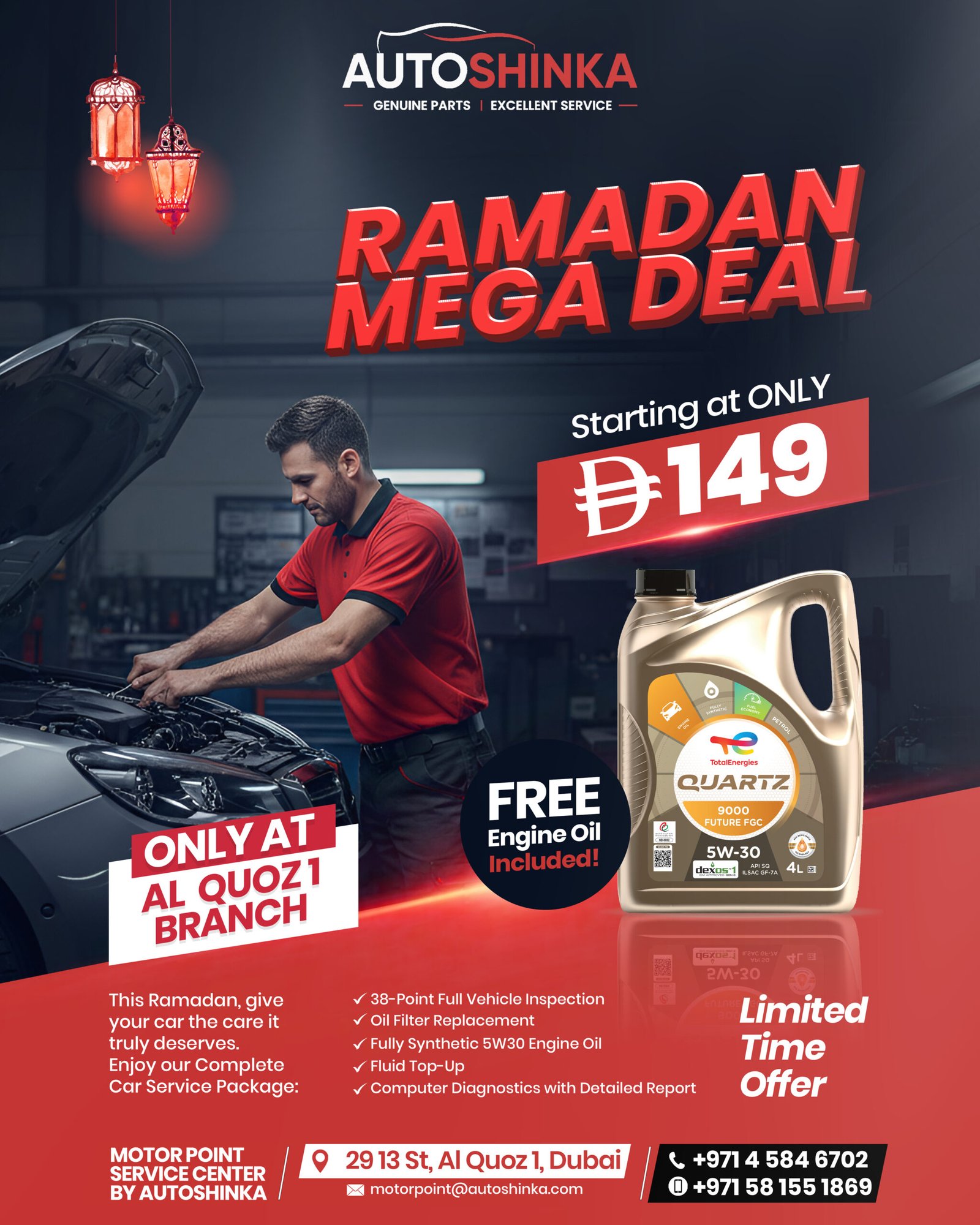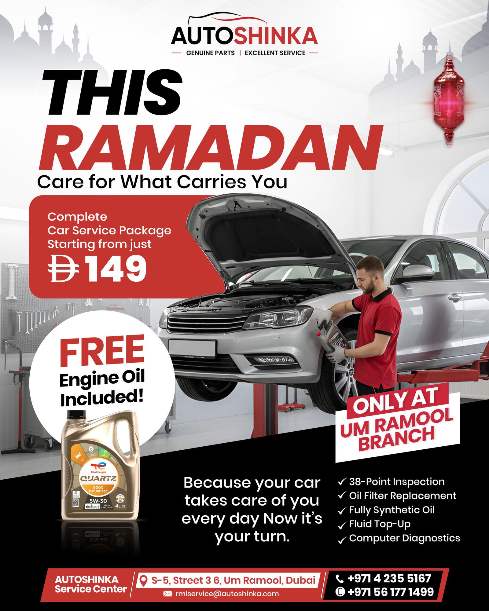Due to Dubai’s climate and driving conditions, it’s generally recommended to service your car every 5,000 to 10,000 km, depending on your vehicle type and manufacturer guidelines. Regular servicing helps maintain performance and prevent costly repairs.